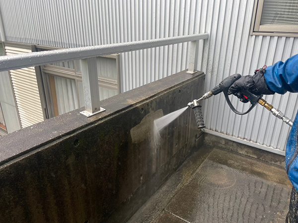 まず、コンクリート表面の汚れや付着物を高圧洗浄機で徹底的に洗浄します。塗料がしっかりと密着する清潔な下地を作ります。