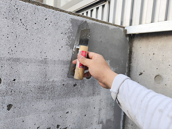 次に、ひび割れや欠けた部分を修復し、平滑な下地を整えます。この工程では、必要に応じてパテやモルタルを使用します。