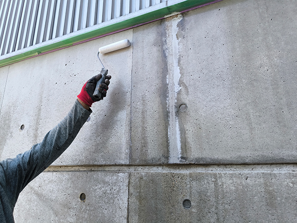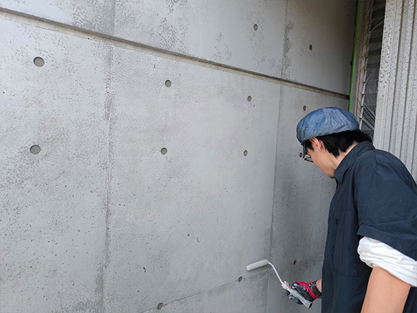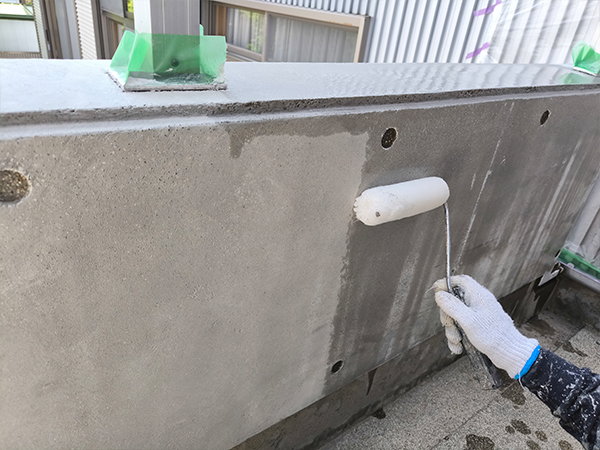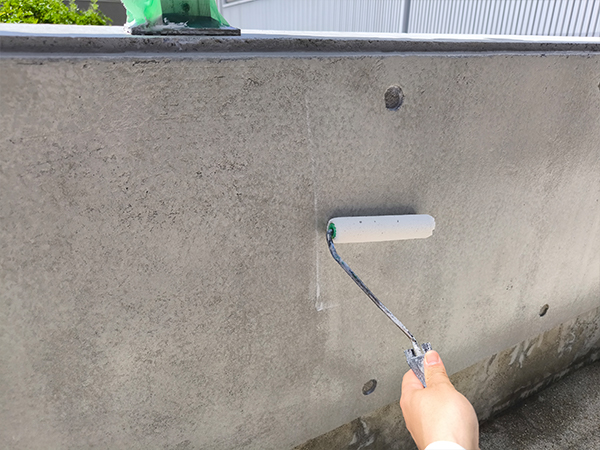 撥水剤を使用して下塗りを行います。コンクリートが水分を吸収しにくくなり、塗装面の耐久性が向上します。